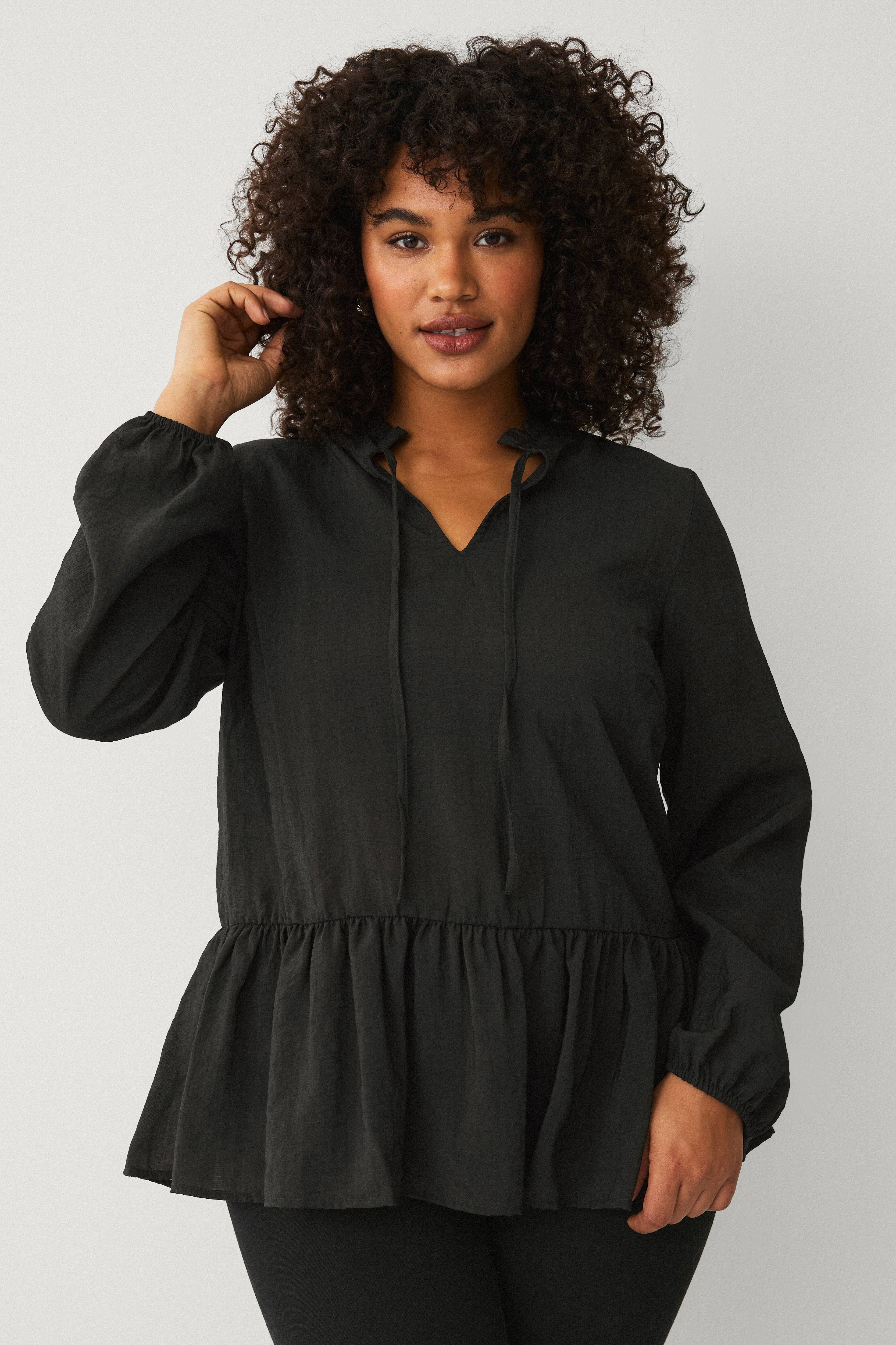 • Plus-koot• Levenevä malli peplum-mallilla• Pyöreä pääntie pienellä röyhelöreunalla ja nyörillä edessä• Pitkä, leveä hiha kuminauhalla hihansuissa• Poimu lantiolla leveydellä alhaalla