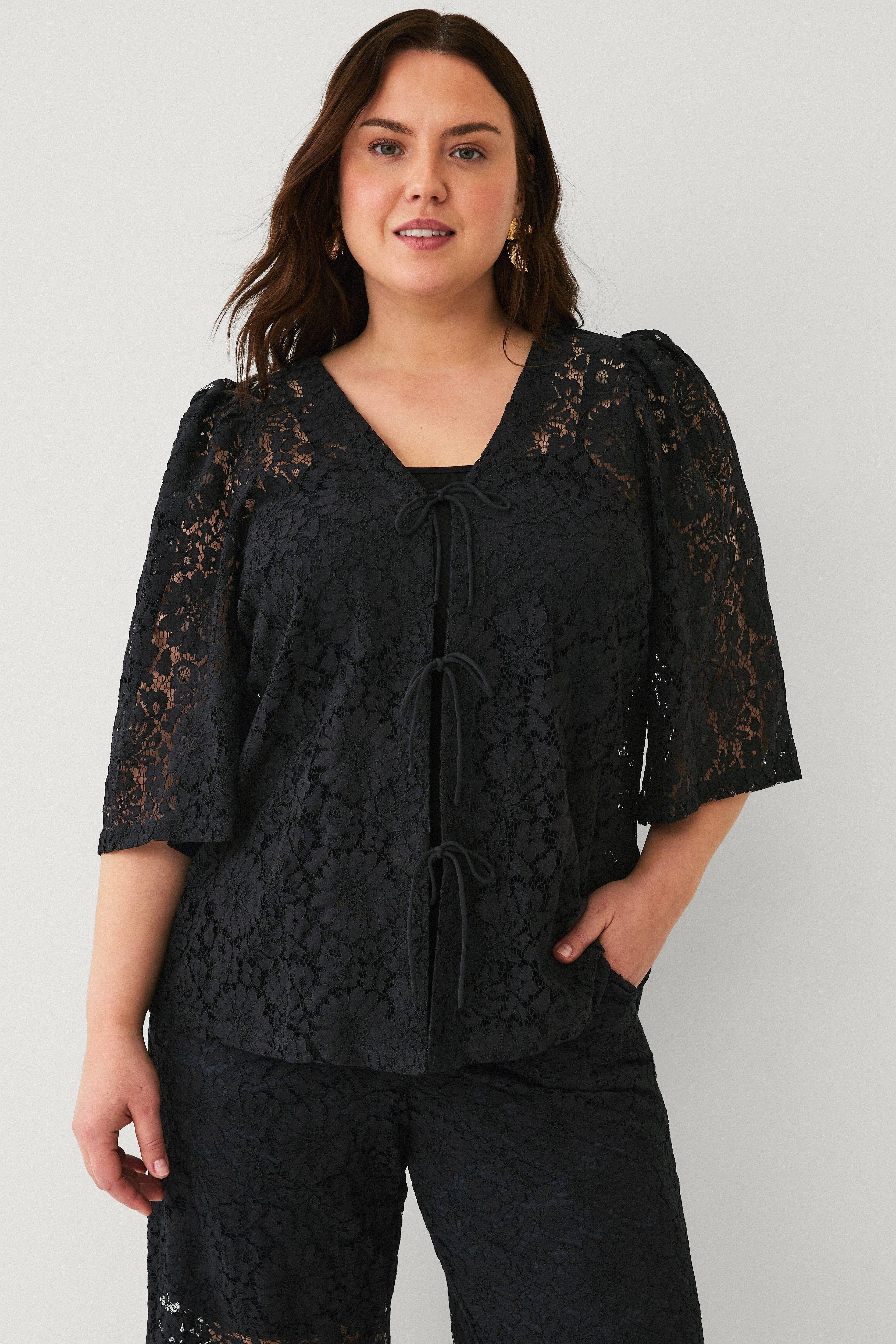 • Plus-koot• Suora, läpinäkyvä malli pitsistä• V-muotoinen pääntie• Nyöri eturintamassa• Leveä, 3/4-pituinen bubble-hiha