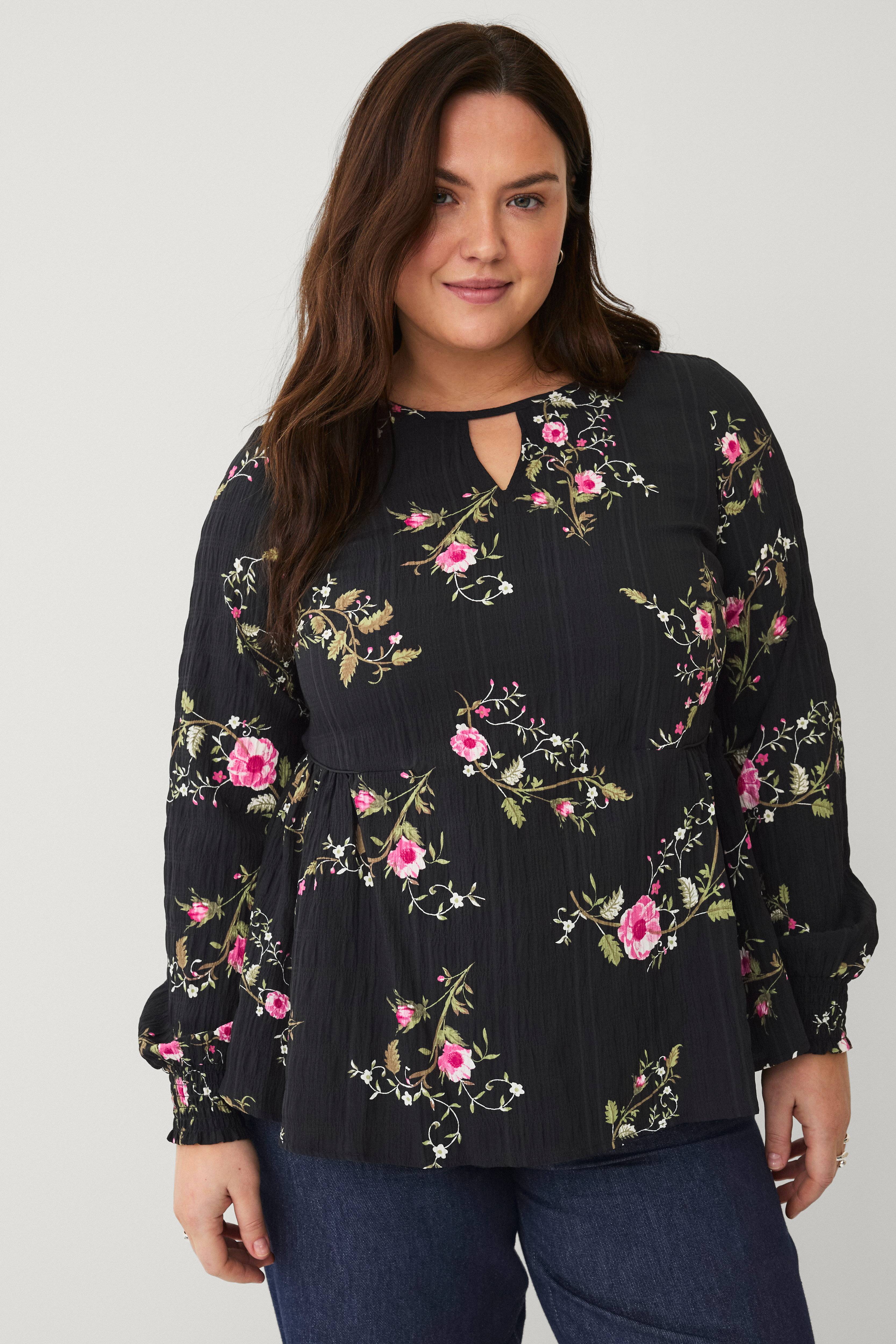 • Plus-koot• Levenevä malli krepistä• Kaula-aukko pienellä halkiolla edessä• Pitkä hiha rypytyksellä hihansuissa• Korostettu vyötärö takaosa ja sivuilla