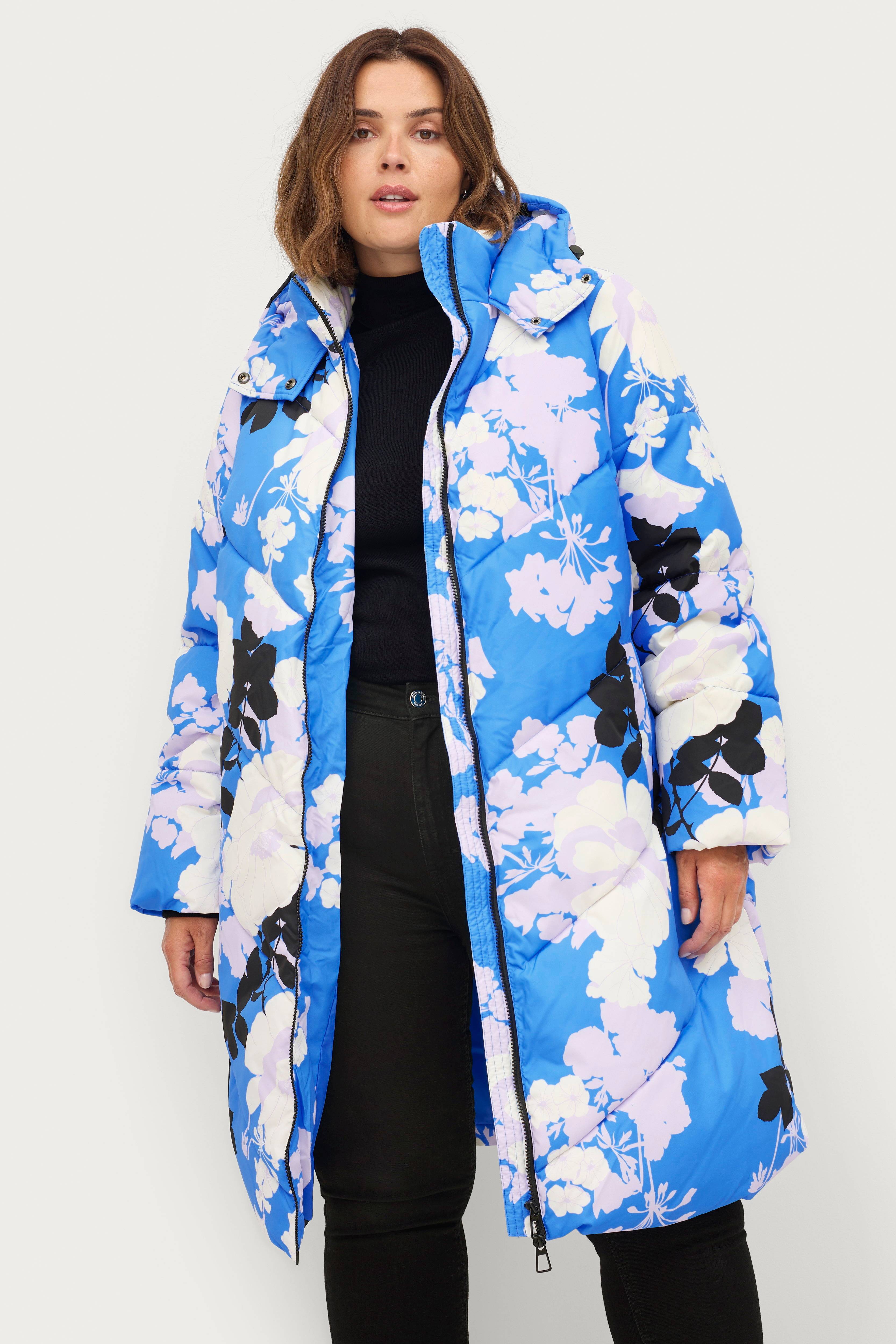 • Pitkä, tikattu, topattu talvitakki • Painettu kukkakuvio • Kiinnitetty huppu kiristysnyörillä ja neppareilla edessä • Kaksisuuntainen vetoketju • Kaksi taskua nepparilla • Ribbiresorit hihansuissa • Plus-koot • Pituus: 101 cm koossa S