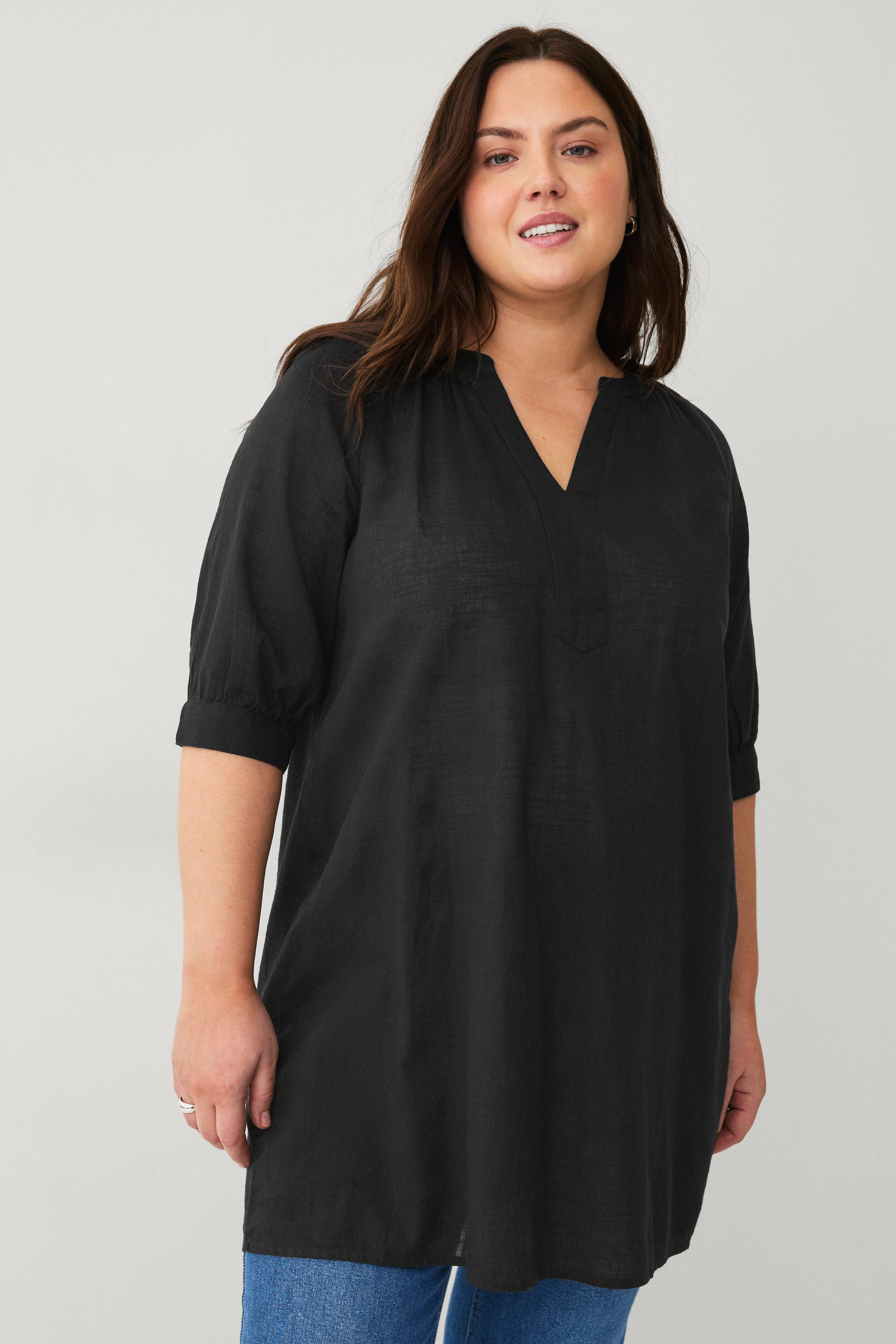 • Plus-koot• Lievästi levenevä malli• Pyöreä pääntie rypytyksellä ja halkiolla edessä• Suorat, 3/4-pituiset raglanhihat hihansuulla• Pituus: 89 cm koossa S