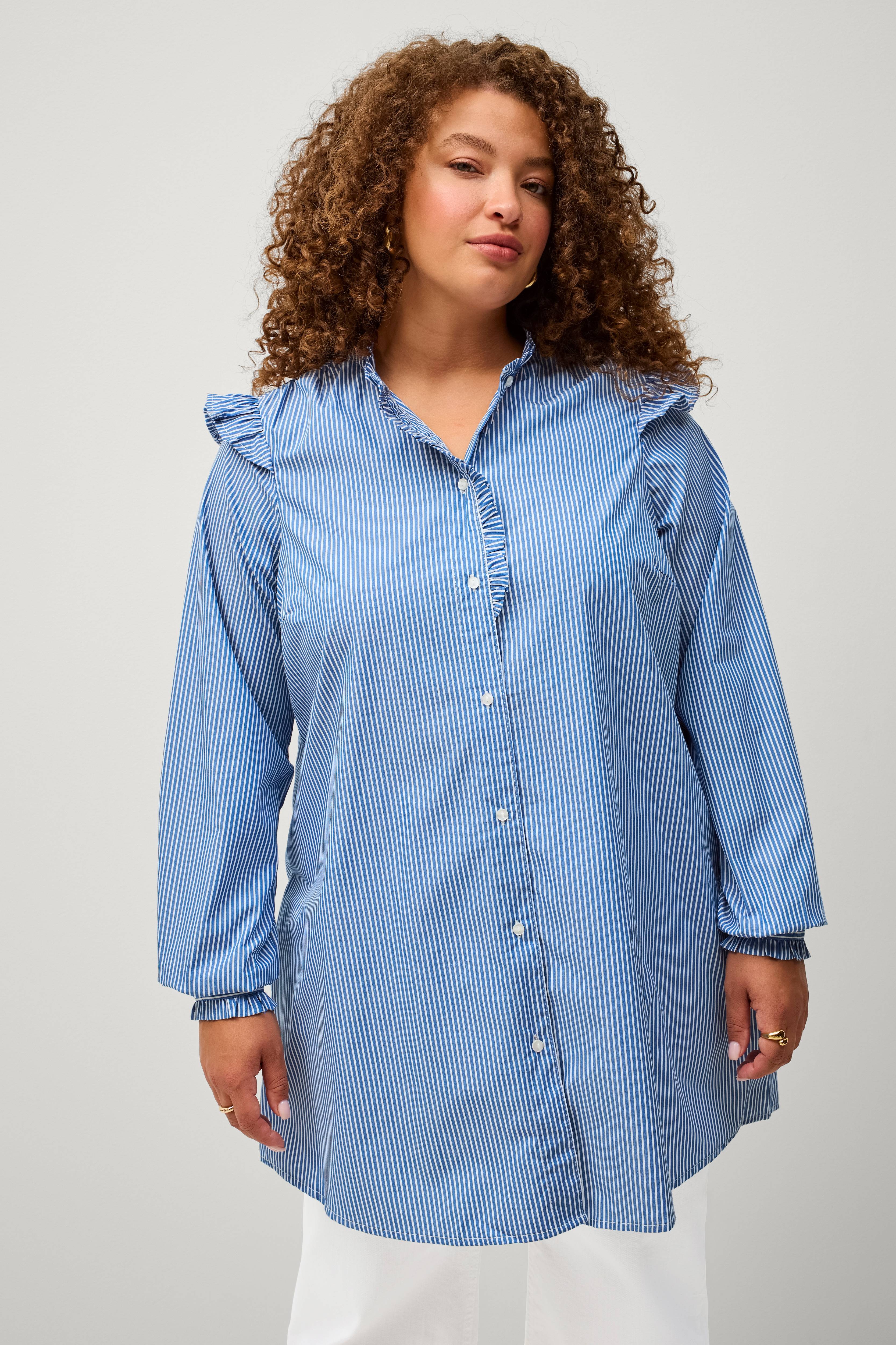 • Levenevä, rento malli • Pyöreä pääntie pienellä röyhelöllä • Napit suoraan eteenpäin • Röyhelö olkapäiden yli • Pitkä hiha ohuella hihansuulla • Pyöristetty helma • Pituus: 86 cm koossa S