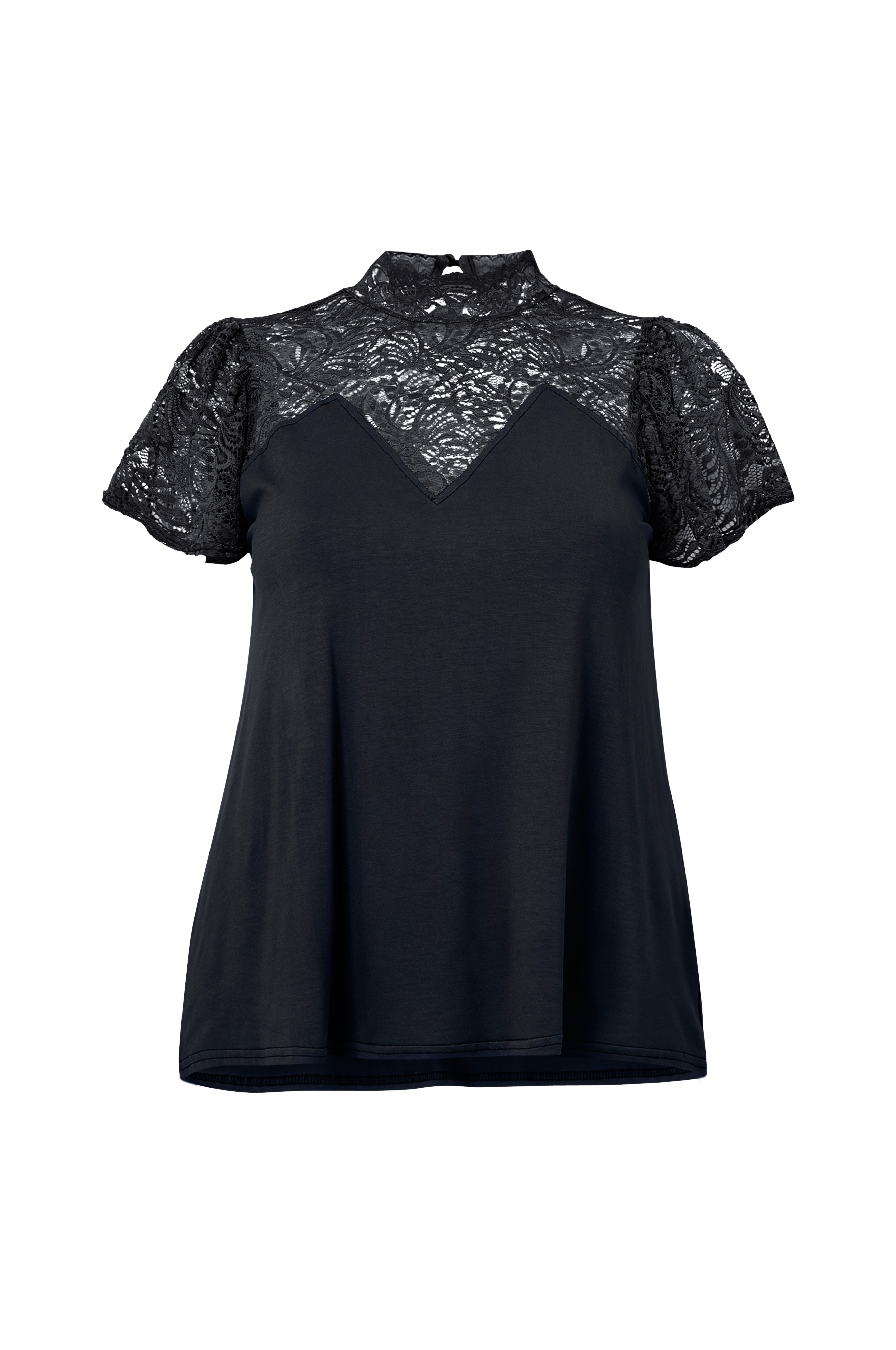 A-linjainen malli, jossa lyhyet, leveät perhoshihat, pystykaulus ja pääntiessä napit selässä. Pehmeää trikoota, jossa läpikuultavaa pitsiä yläosassa.
