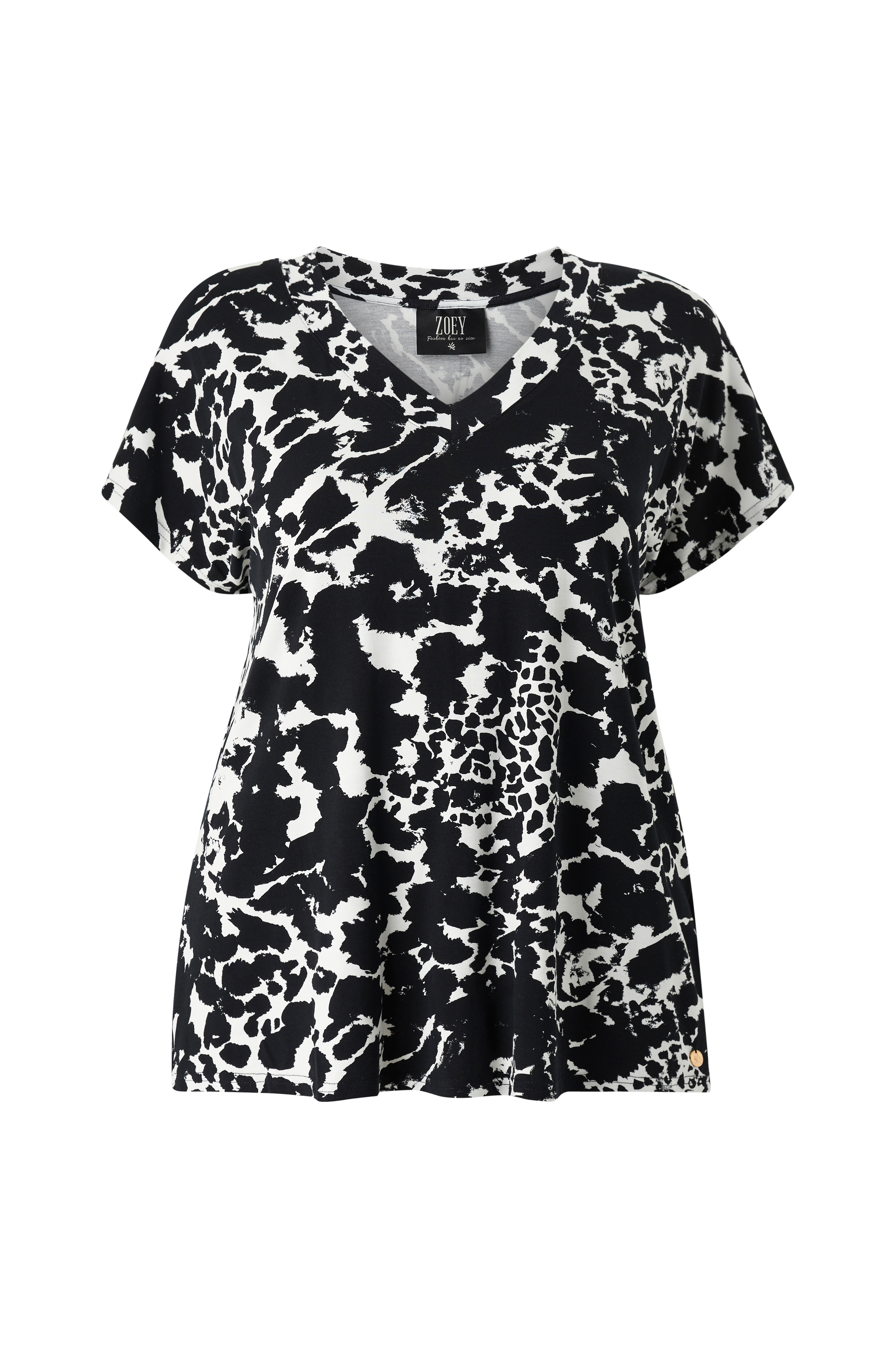 • Kuvioitu toppi viskoosijersey-kankaasta• V-kaula-aukko• Lyhyet hihat• Plus-koot